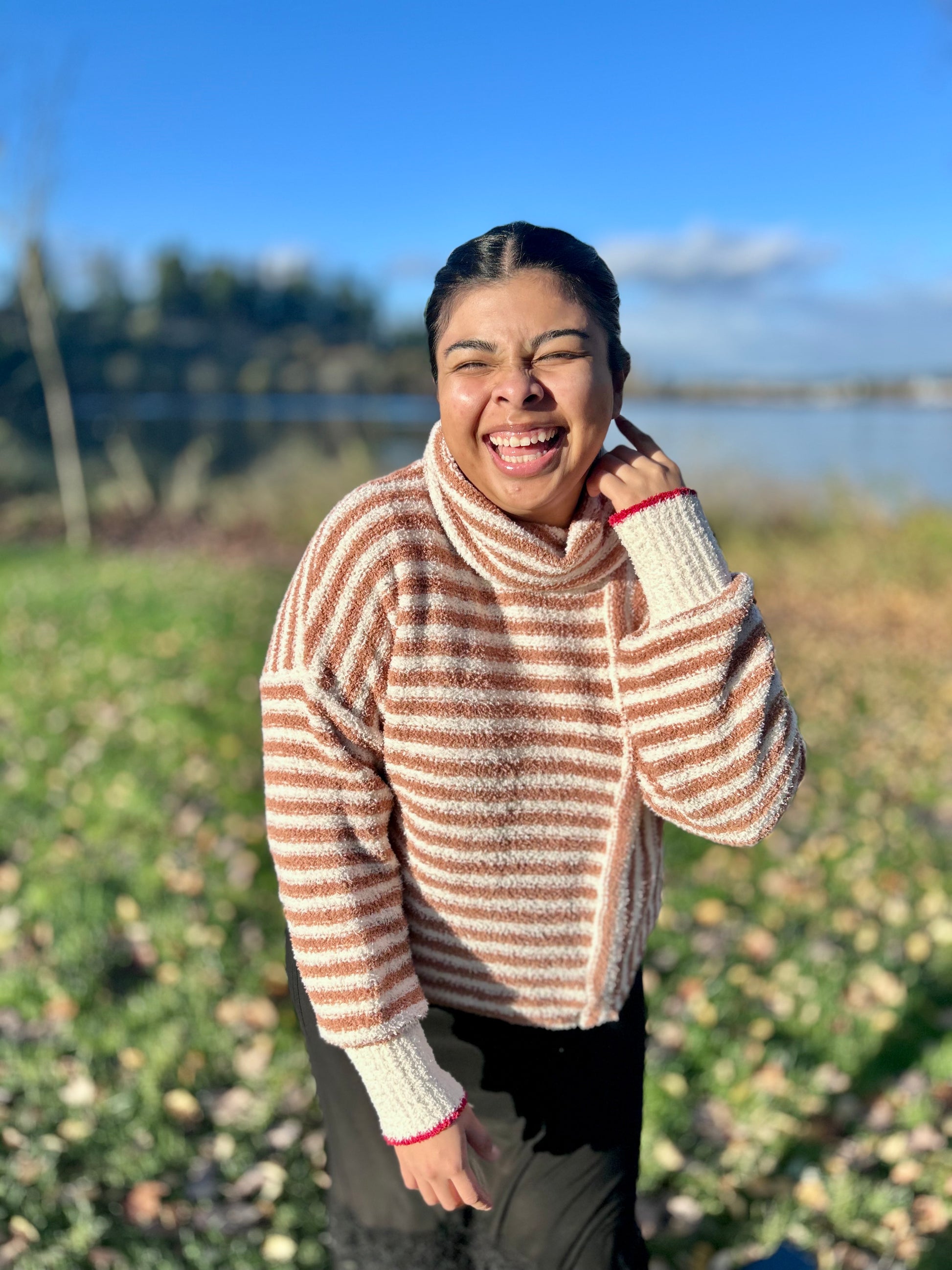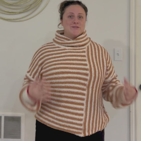 - Mock Neck Soft Striped Knit Sweater Top - Oversized - Drop Shoulder - Long Sleeve - Model wearing a Large