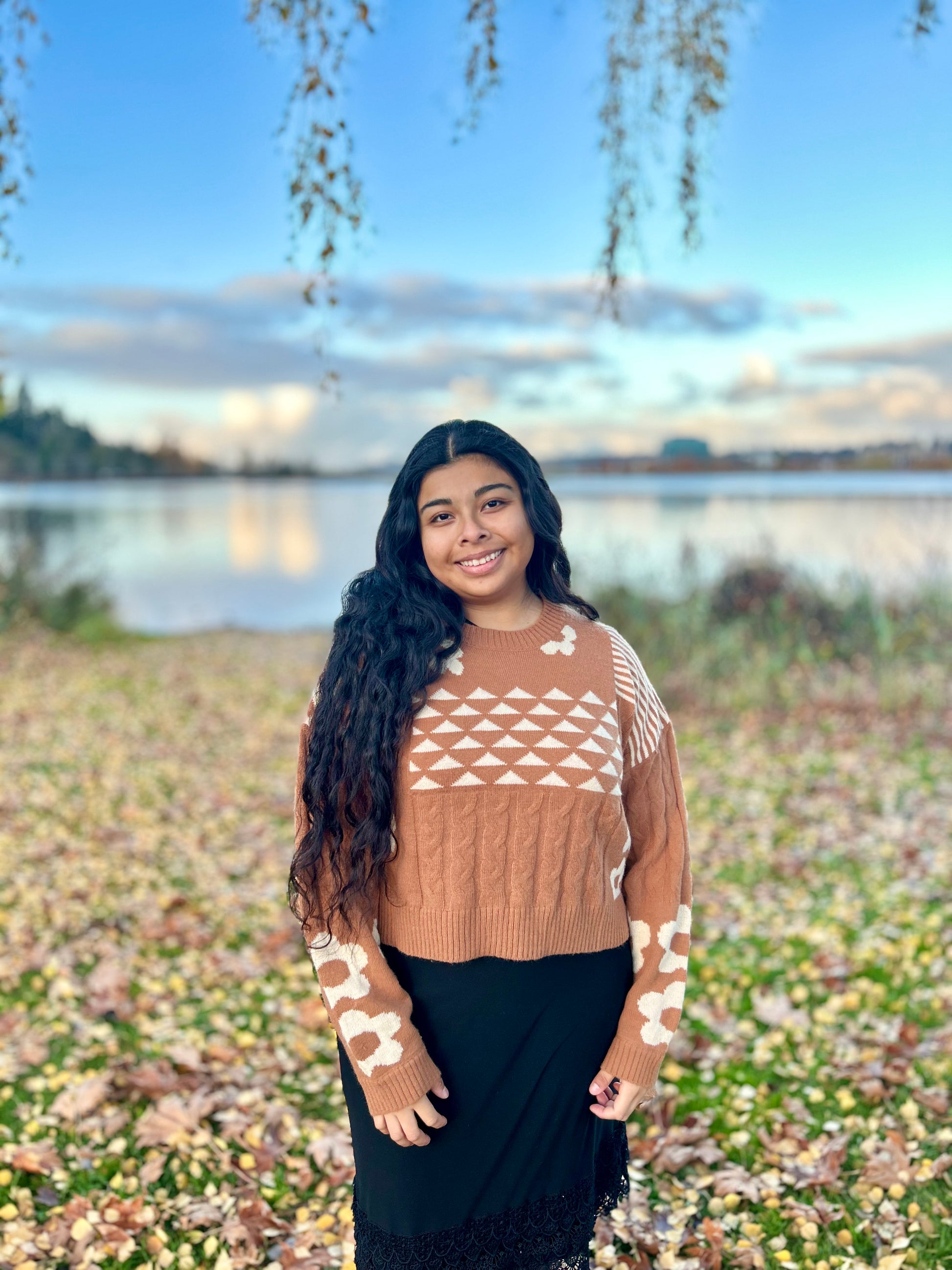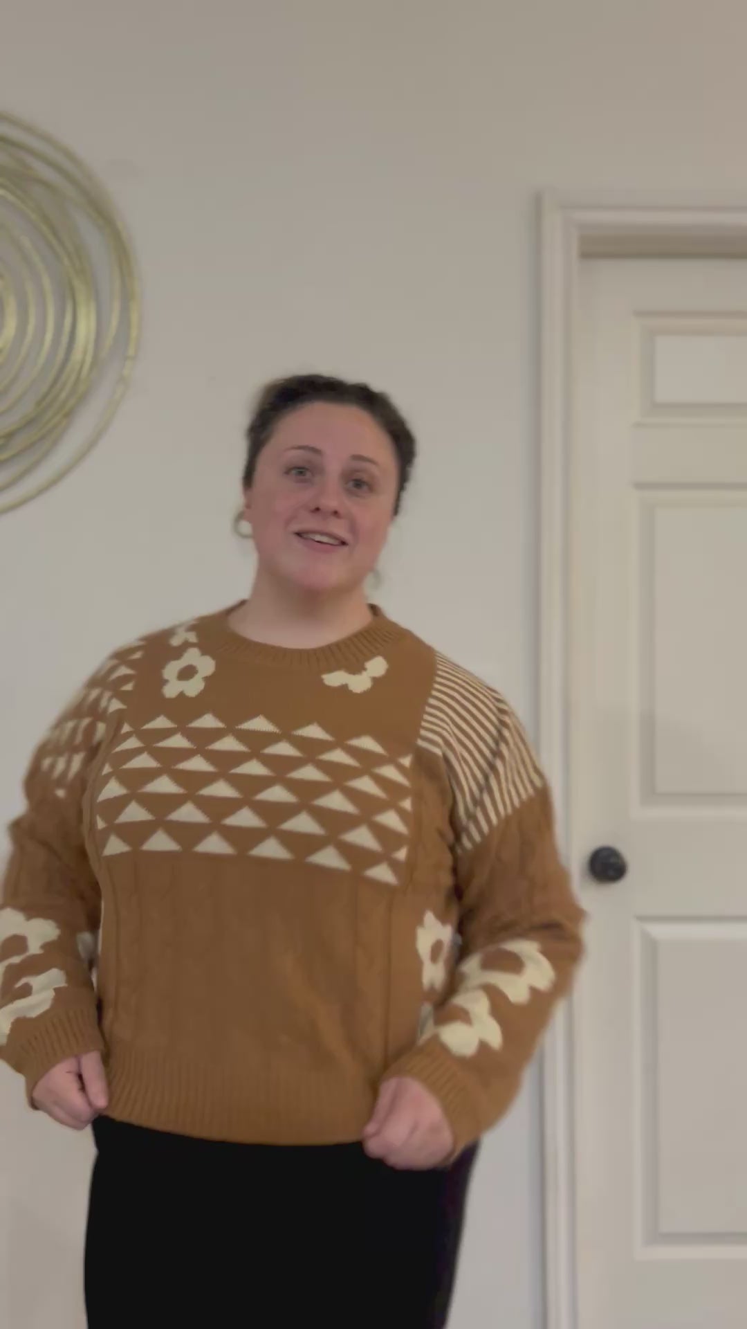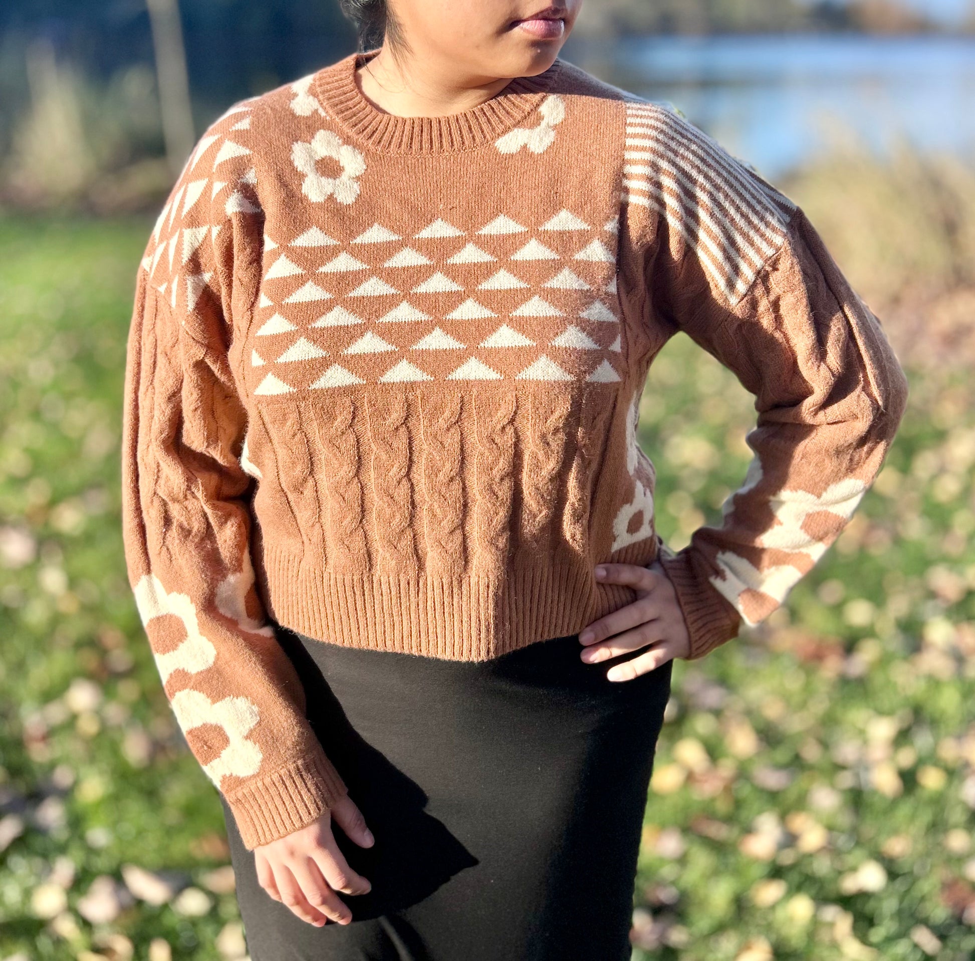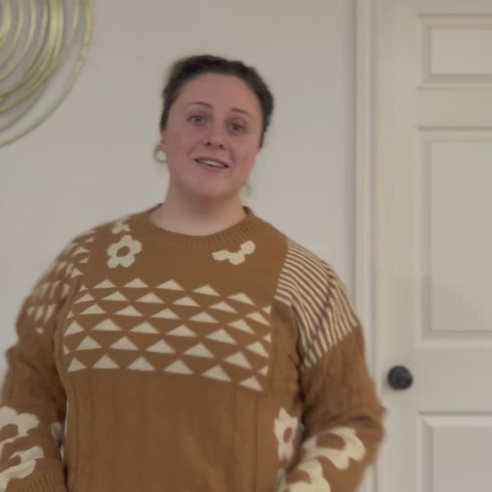 - Oversized Balloon Sleeve Graphic Knit Sweater Top - Floral Print - Round Neck - Long Sleeve - Ribbed Hem (Model height: 5"9", wearing a Small,