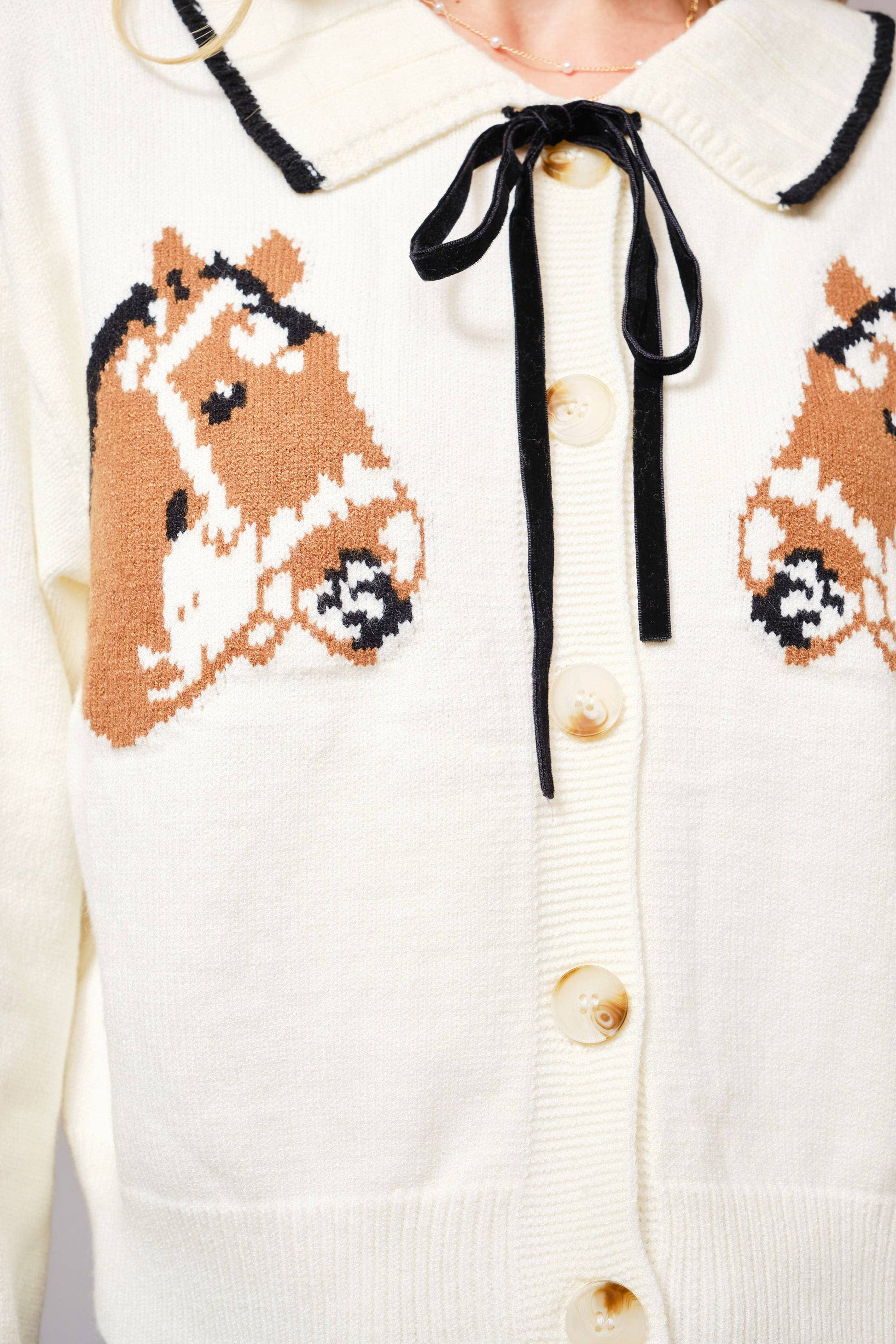 Whimsical button-up cardigan featuring horse face graphics, cowboy-inspired sleeve patterns, and a Peter Pan collar with velvet ribbon tie. 50% Viscose 28% Polyester 22% Polyamide Model is 5'10" and wears a size Small