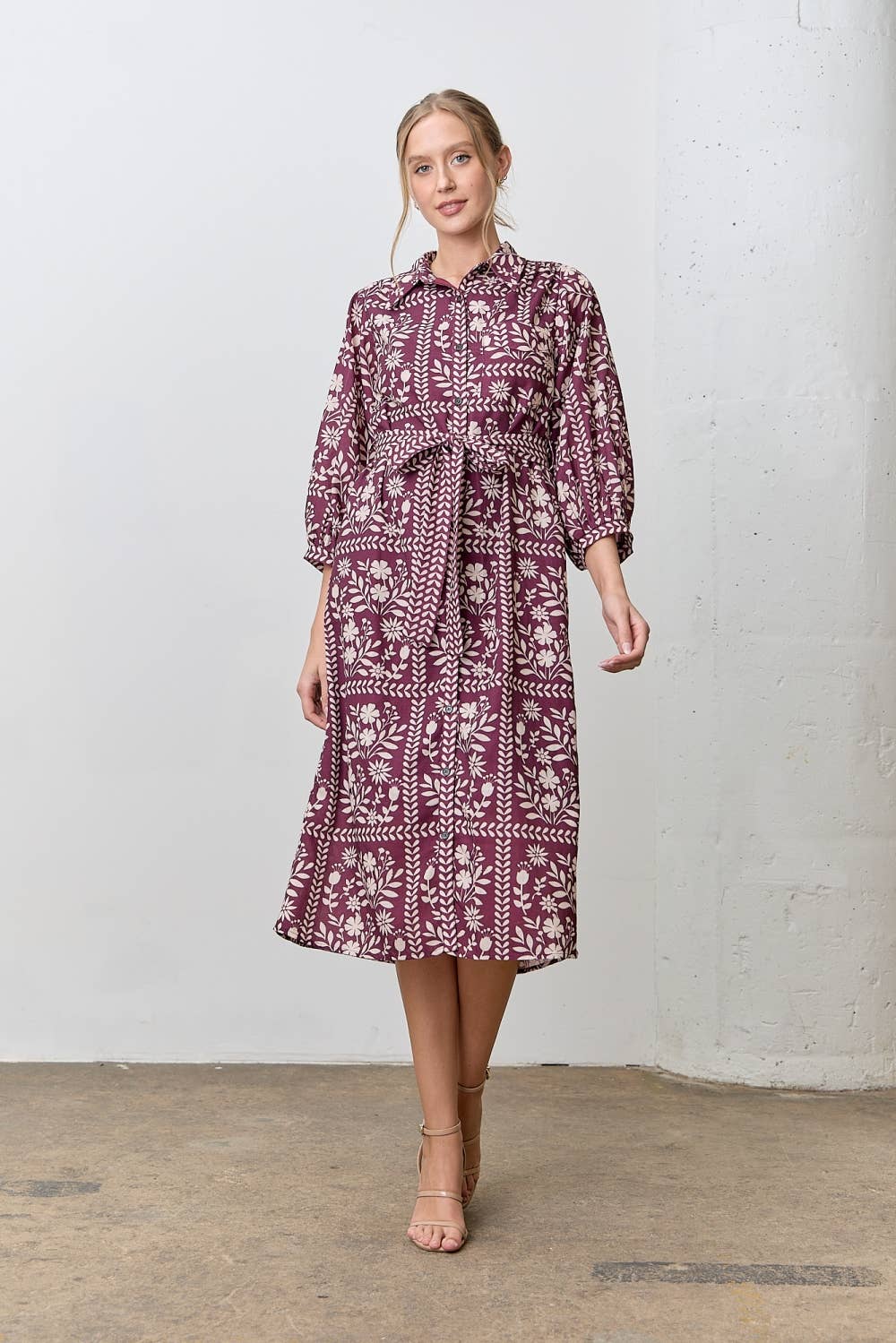 +MIDI DRESS +LEAF/FLORAL PRINT +REMOVABLE TIE BELT +BUTTON DOWN MODEL IS WEARING S