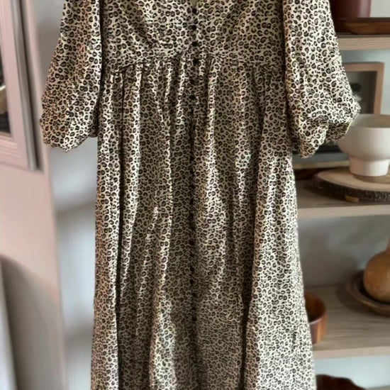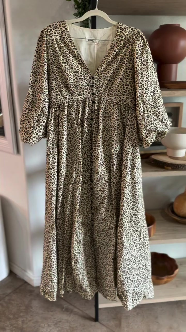 BUTTON DOWN MAXI DRESS FEATURING: - COTTON BLEND LEOPARD PRINT FABRICATION - FULLY FUNCTIONAL BUTTON DOWN DESIGN - ELASTIC SMOCKED WAISTBAND AT BACK - 3/4 PUFF SLEEVES - HIDDEN SIDE ZIPPER - FULL LINING