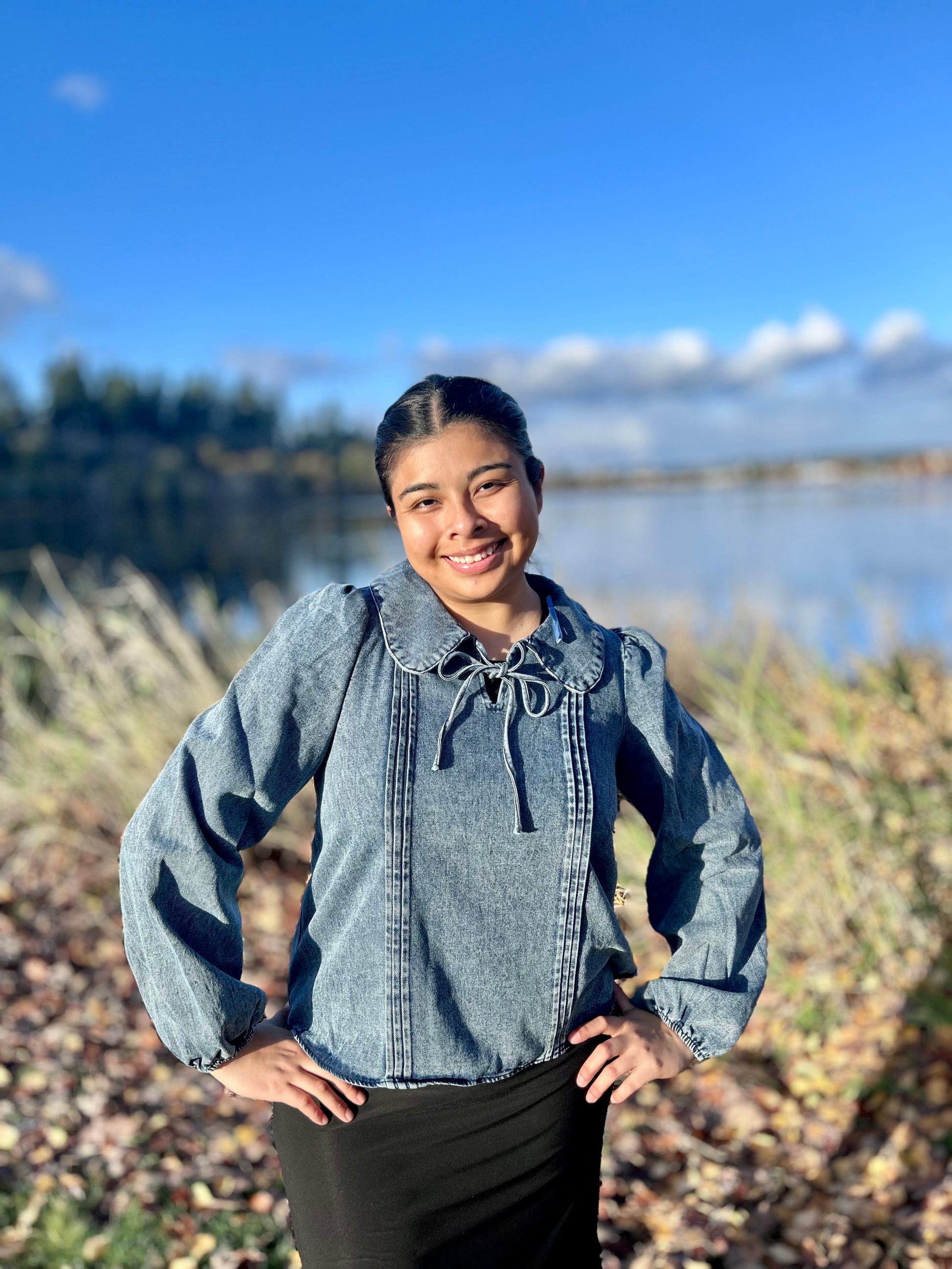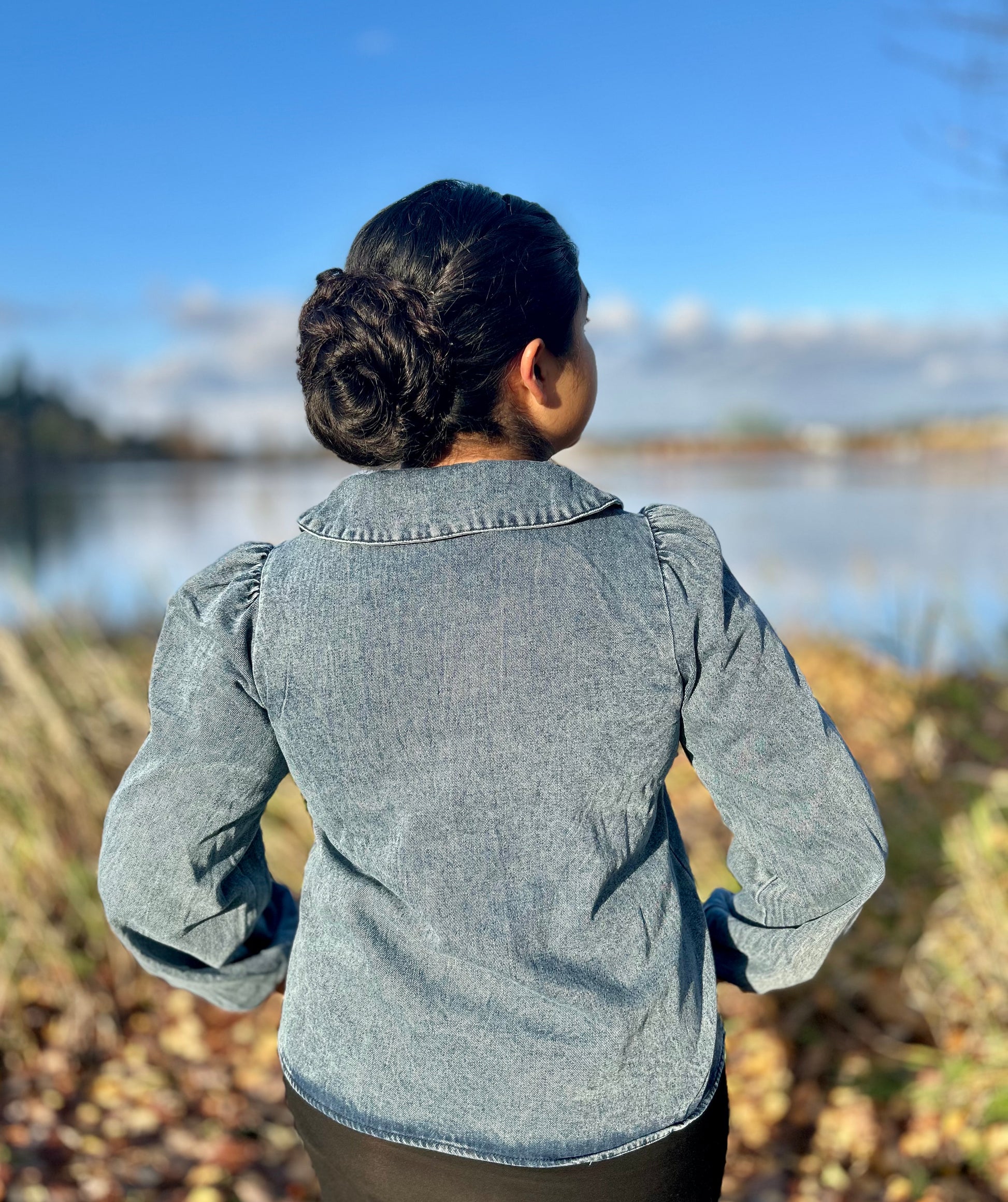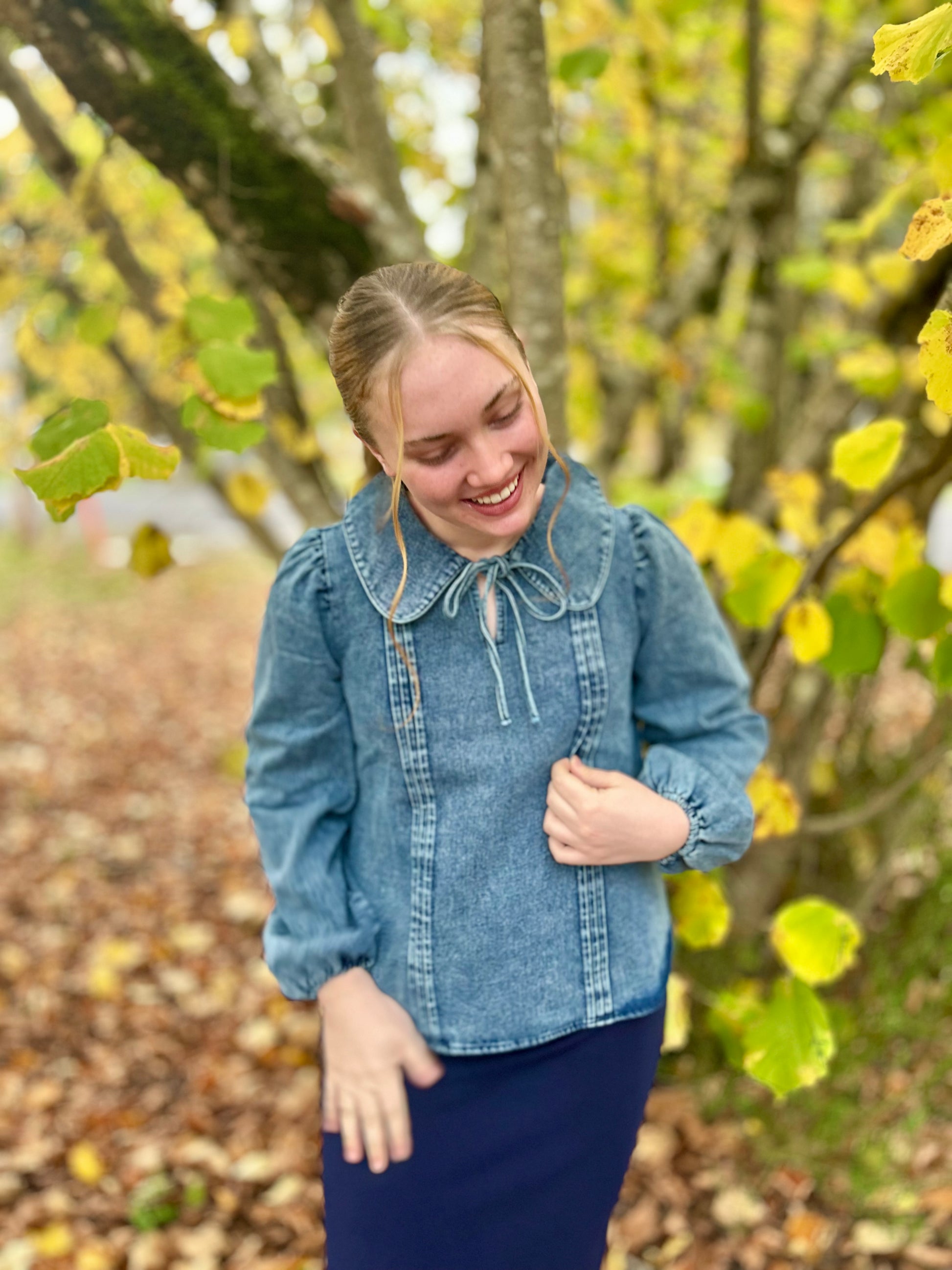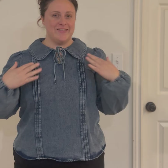 - Mineral Washed Chambray Denim Blouse Top - Long Sleeve - Front Tie - Pintuck Detail Model wearing size Large