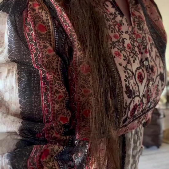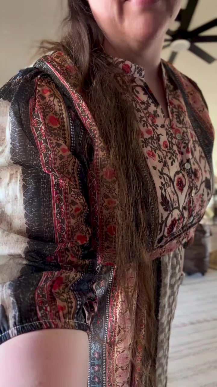 Capture a stunning vintage aesthetic with this flowing midi dress. It features a rich, tapestry-inspired patchwork print in warm, versatile tones. The elastic empire waist, button-front, and subtle flutter sleeves create a comfortable, universally flattering silhouette. Perfect for bohemian style, travel, and transitional seasons. -Tapestry -V-Neck -Tiered -Chiffon Model is wearing a size small