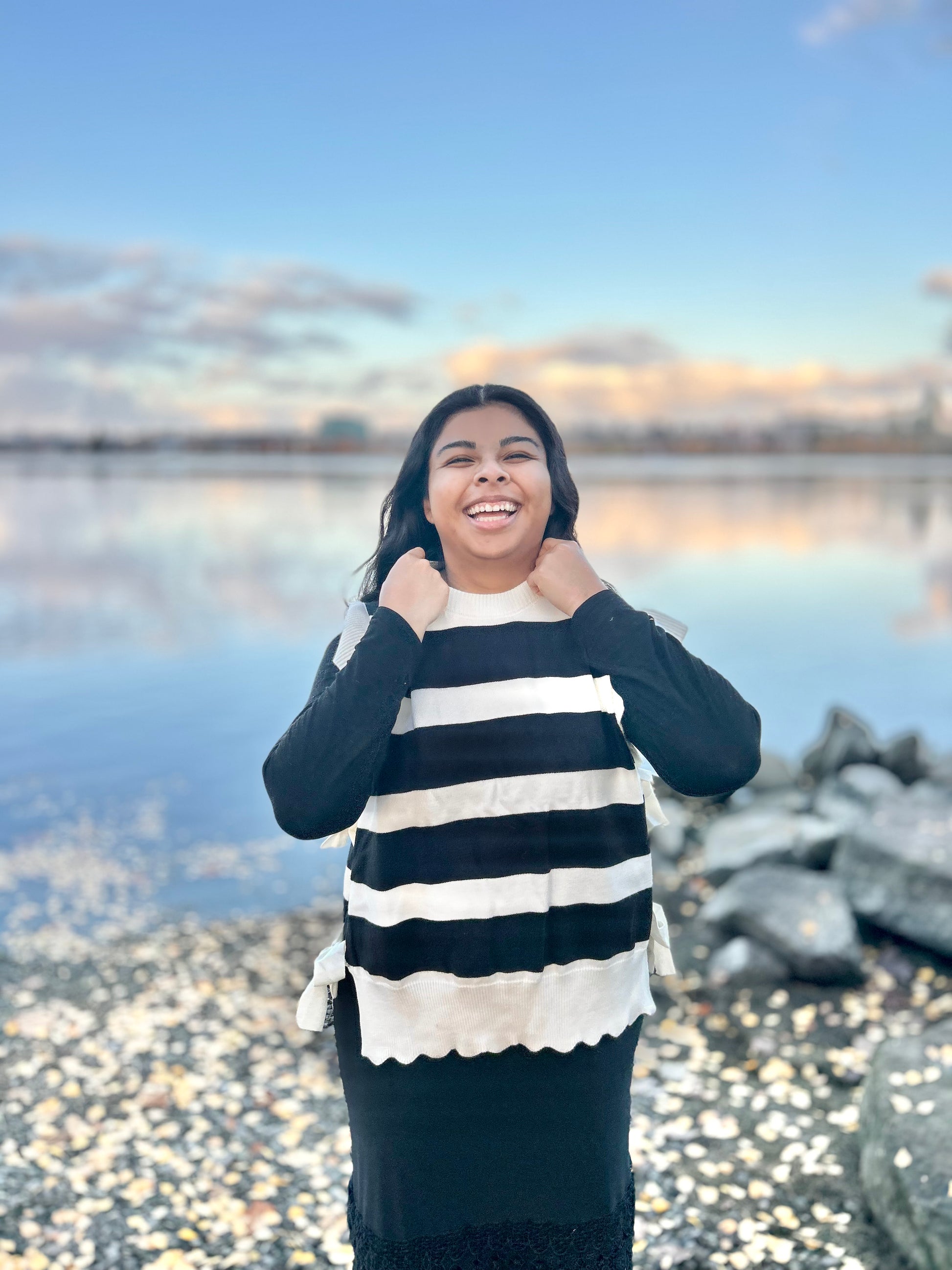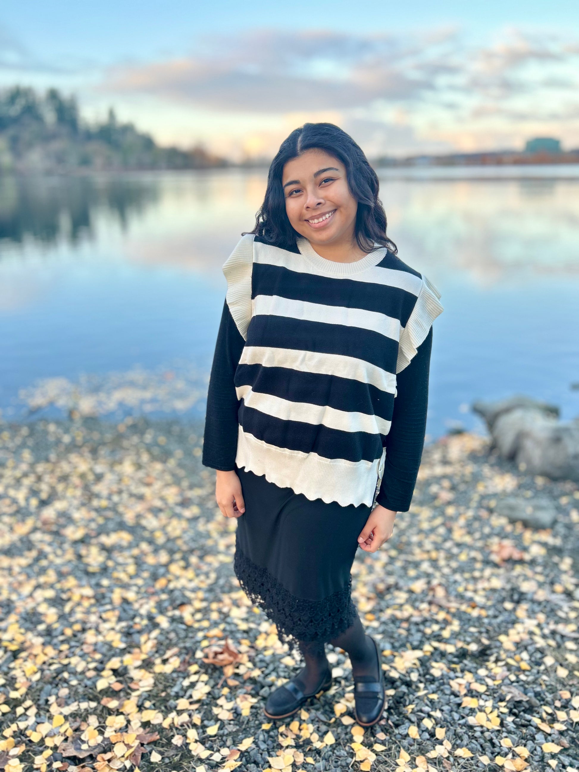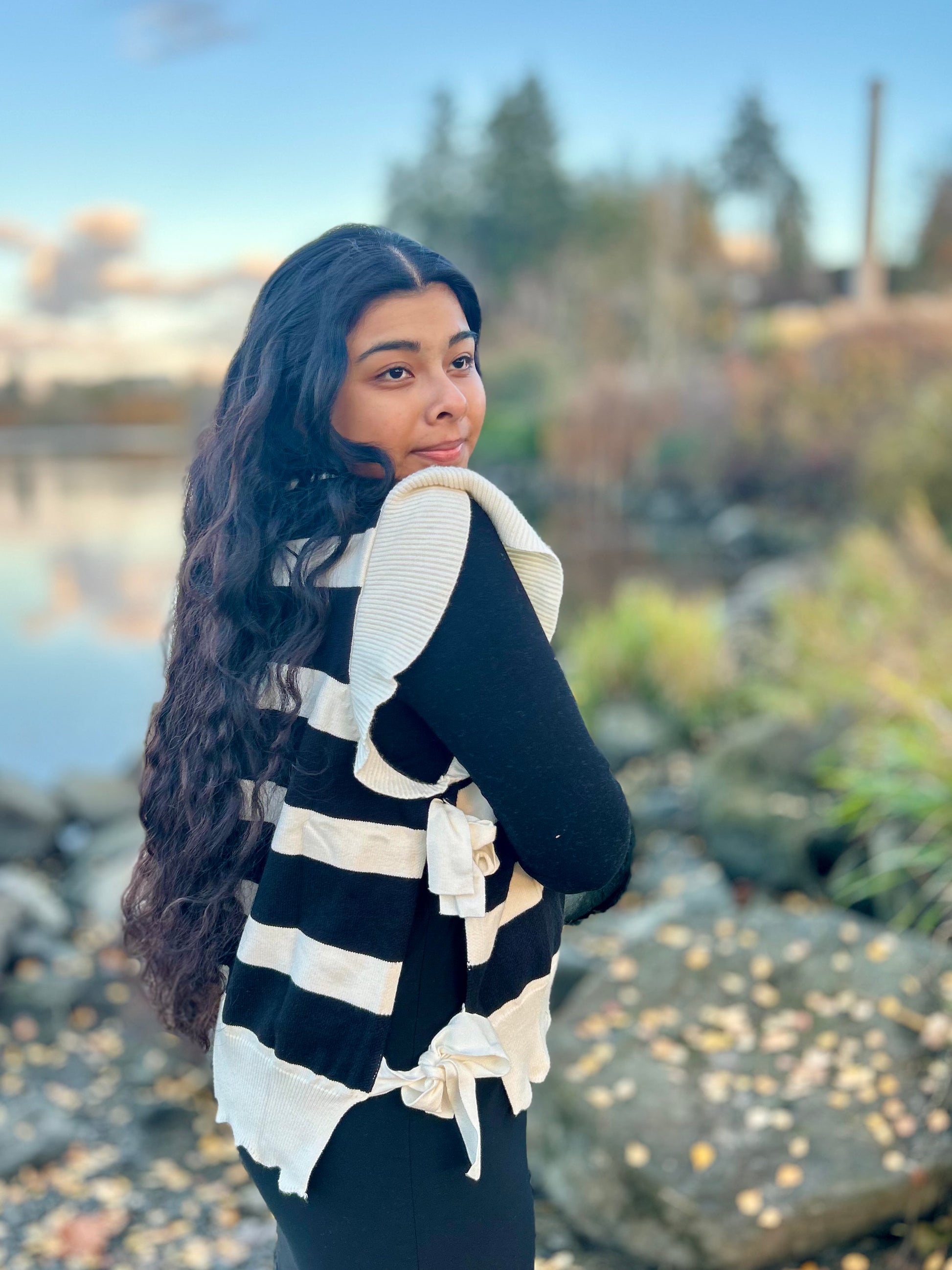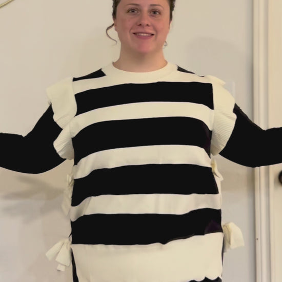 Bold striped knit sweater top with ruffled cap sleeves and scalloped hem, featuring ribbon side ties