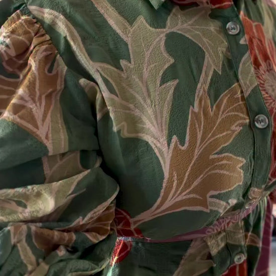 Textured floral shirt dress with puff sleeves, a belted waist, and button-down front. Also available in sizes S to L: Style no. ID18435. Total Length: 52" Content: 97% Polyester, 3% Spandex