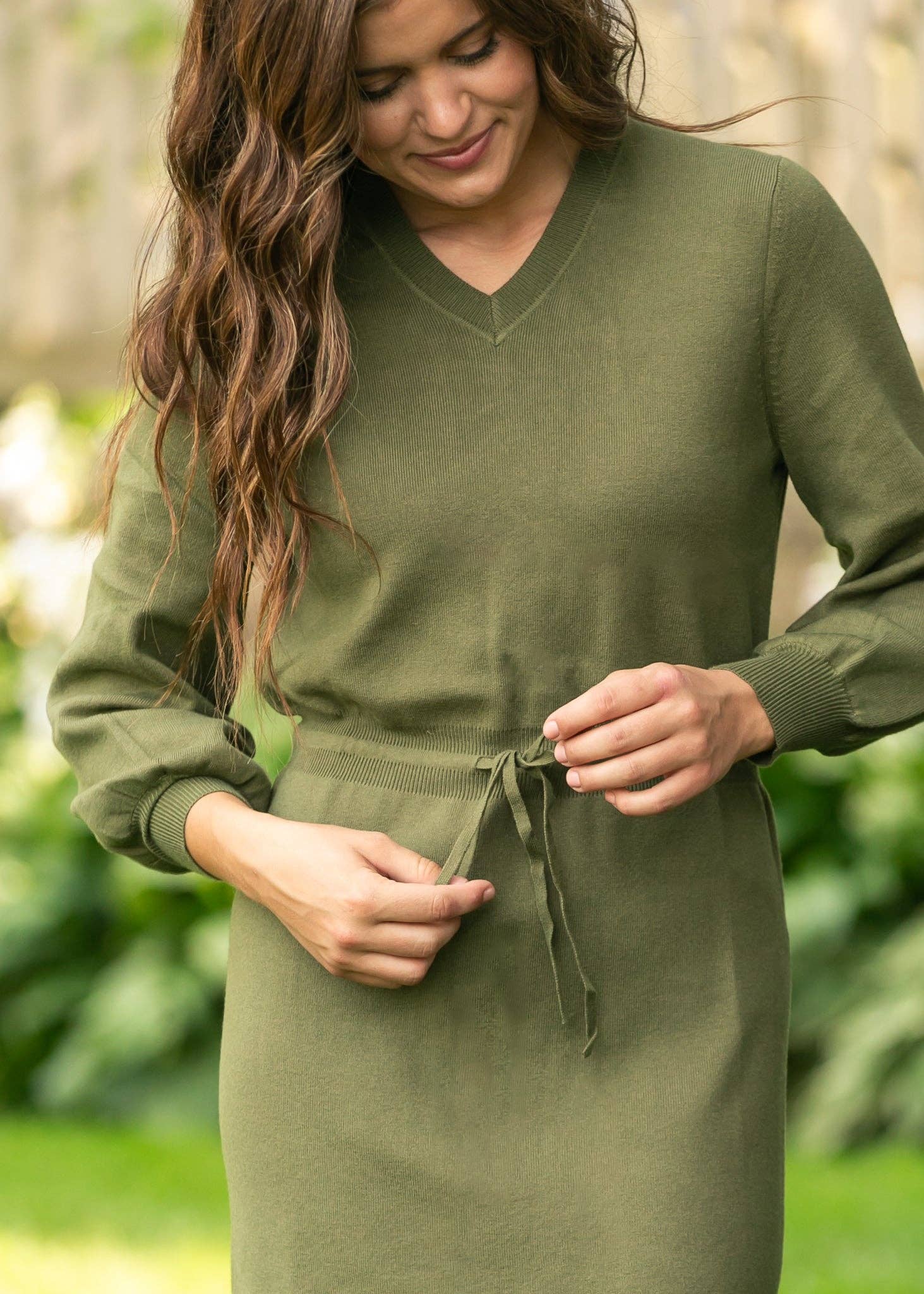 The Wren Long Sleeve V-Neck Sweater Dress is an Inherit Design that combines modest comfort and effortless style! Crafted from a OH SO super soft knit fabric that will keep you comfortable all day! Featuring a midi length, long balloon sleeves with cuffs, a drawstring waist, and a modest v-neck, this cozy dress will keep you looking and feeling great all day! No matter the occasion, you can always count on the Wren! * Product Details | Balloon Sleeve, V-neck, Self-Tie Belt * Style | Midi, Long Sleeve * Color | Black, Olive, Dark Taupe SIZING TIPS * Fit | Semi-Fitted * Length | 48"-49" (Varies by Size) * Stretch | Very Stretchy * Model | True to Size